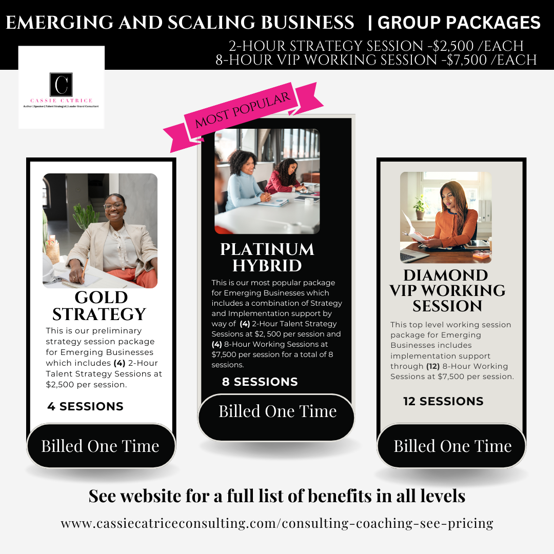 This service DOES NOT INCLUDE a Deep Dive Diagnostic or Strategy in the area of your Employer Branding, Employee Engagement, Employee Culture, Employee Experience, Succession Planning, Career Pathing & Development, Diversity & Inclusion. These are highly specialized and niche processes that each require an individual culture assessment of their own which is offered, booked, billed, and scheduled separately through the Employee Engagement & Culture Assessment followed by 2-Hour Culture Strategy & 8-Hour VIP Implementation specially related to Culture and Engagement .